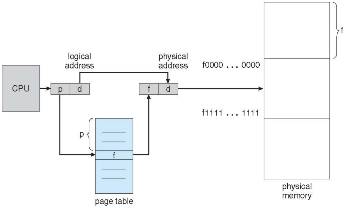 -> CPU에서 나온 페이지 번호는 페이지 테이블에서 f로 치환된다. 오프셋은 변하지 않기 때문에 대체되지 않는다.
