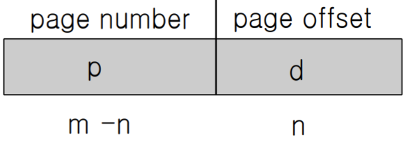 CPU에서 나오는 모든 주소는 페이지 번호(p)와 페이지 오프셋(d) 두 개의 부분으로 나누어진다.