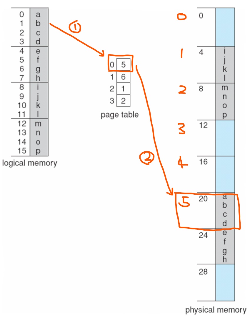 페이지 번호 0번은 페이지 테이블에서 물리 메모리 주소 5번지와 연결되는 것을 확인할 수 있다.
